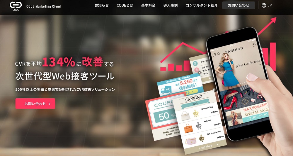 株式会社エフ・コードが提供するポップアップ型のWEB接客ツール。訪問したユーザーの条件に応じて、効果的なタイミングと位置によるバナー表示を行います。導入企業の業種はさまざまですが、サイト離脱率が13.1%改善し、コンバージョンが3倍になった高速バス予約サイトや、ひと月で150件以上の体験レッスンを獲得したオンライン英会話などの事例があります。